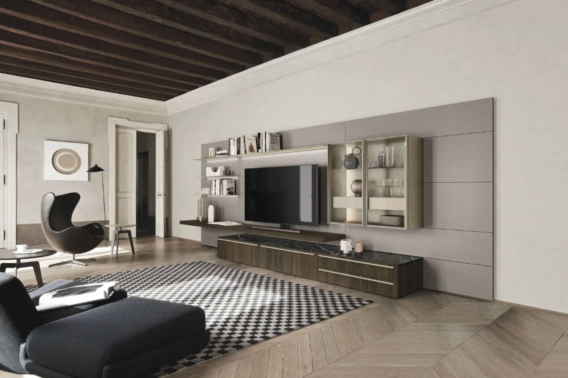 Le Pareti Attrezzate hanno acquisito un posto importante nella zona giorno delle nostre case: sono mobili multifunzionali e salvaspazio sempre realizzabili su misura. Attraverso un gioco dinamico di accostamenti fra accessori a giorno o vani chiusi, le Pareti Attrezzate moderne arredano il soggiorno sfruttando bene ogni spazio. Questa parete attrezzata è una delle soluzioni della firma e ti permetterà di progettare il living seguendo le più personali problematiche abitative.